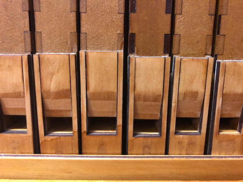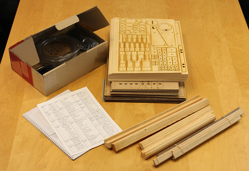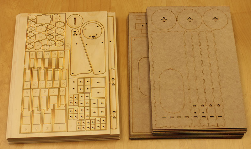 A closeup of the 23 tiles of laser cut parts contained in the kit